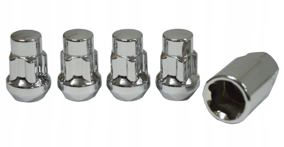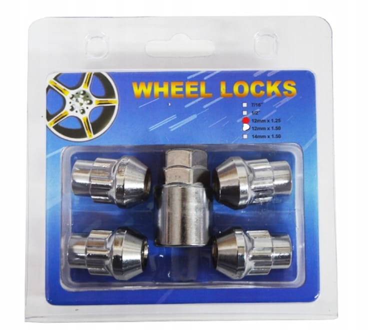 Zestaw nakrętek zabezpieczających przed kradzieżą kół. Zawiera 4 nakrętki oraz specjalną nakładkę/adapter pasującą do większości kluczy nasadowych. Unikalny kształt nakrętek sprawia, że można odkręcić je tylko i wyłącznie za pomocą dołączonej nakładki na klucz.