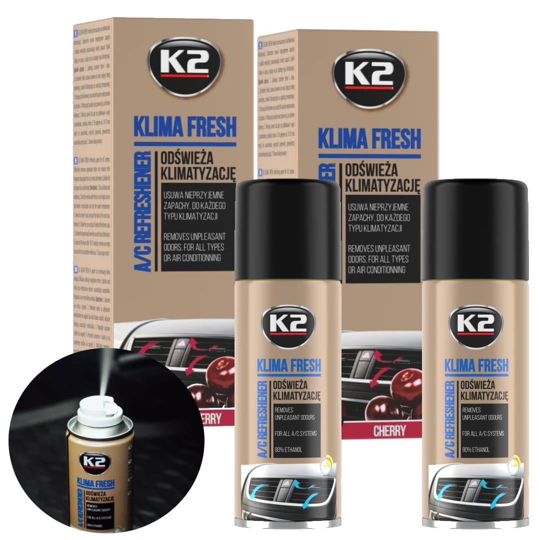 K2 KLIMA FRESH o zapachu Wiśni to niezwykle skuteczny i łatwy w użyciu środek do odświeżania klimatyzacji w samochodzie, który skutecznie eliminuje nieprzyjemne zapachy, zapewniając jednocześnie długotrwały efekt świeżości. Poprawia komfort podróżowania oraz przyczynia się do utrzymania higieny w układzie wentylacyjnym pojazdu. Nadaje się do każdego typu klimatyzacji. Cały proces nie zabiera więcej niż kilkanaście minut, sprawia to, że każdy kierowca może zadbać o czystość klimatyzacji bez zbędnego wysiłku. Po jego użyciu pozostawia przyjemny zapach wiśni.