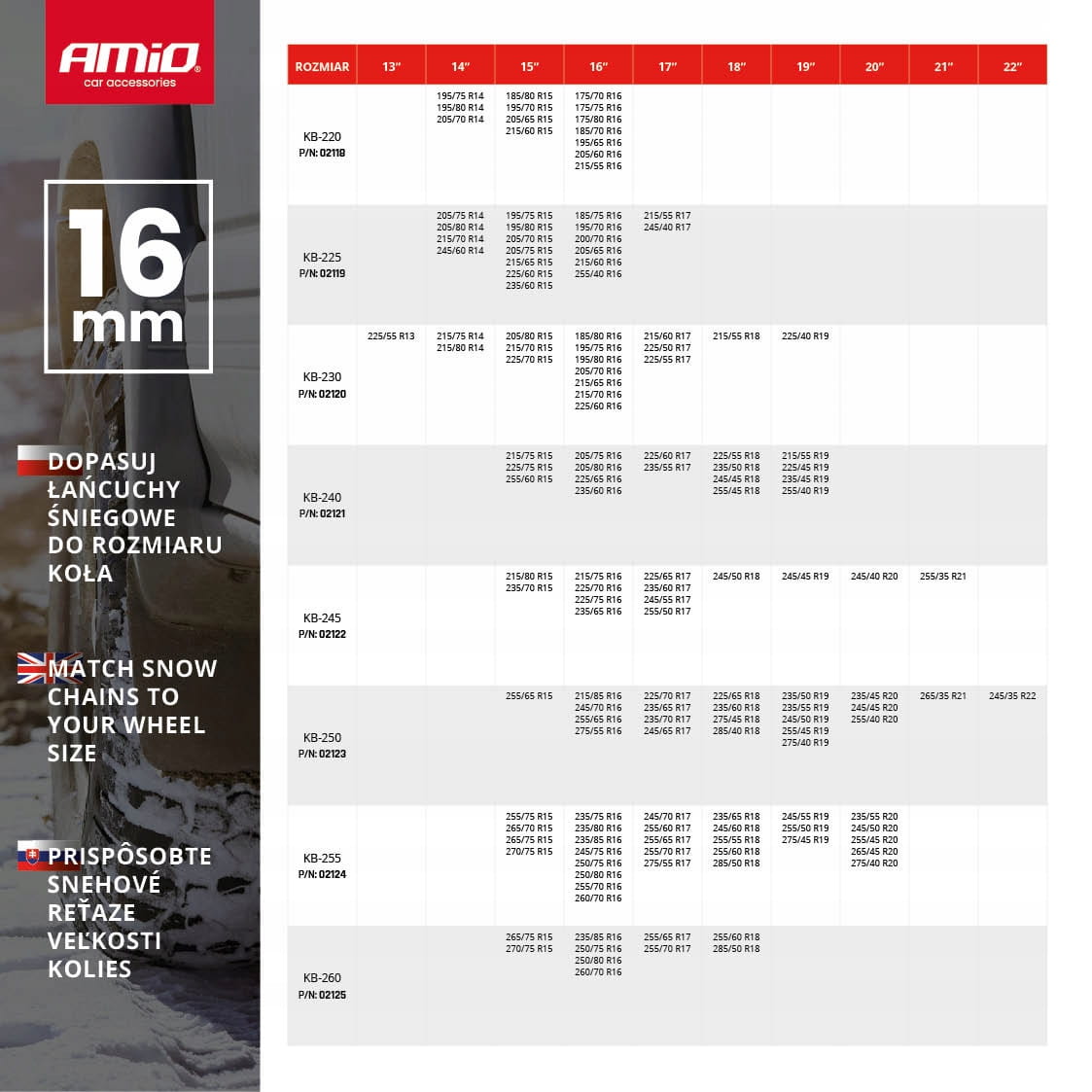 Łańcuchy śniegowe KB-260 16 mm 4x4 - komplet na 2 koła napędowe