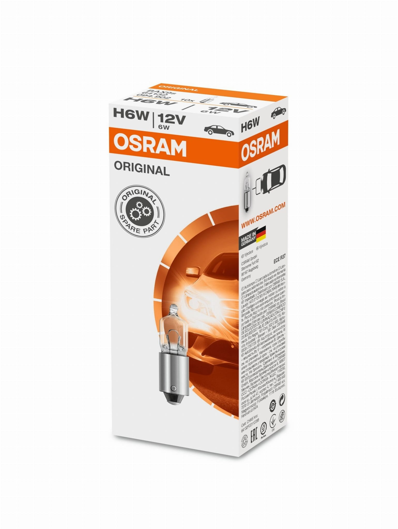 Żarówka OSRAM H6W Original to wysokiej jakości halogenowa żarówka samochodowa o napięciu 12V i mocy 6W, wyposażona w trzonek BAX9s. Zapewnia niezawode i równomierne oświetlenie - dokładnie takie, jakiego oczekują producenci samochodów. Seria Original to standard OEM, dzięki czemu produkt ten często jest montowany fabrycznie w nowych pojazdach.