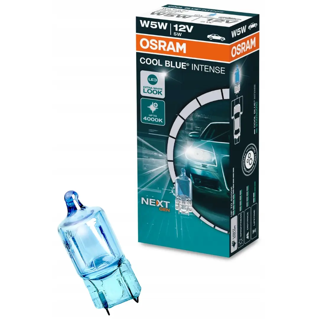 Żarówki W5W OSRAM Cool Blue Intense Next Gen to nowoczesna generacja halogenowego oświetlenia, łącząca biało - niebieski efekt światła z najnowszą technologią OSRAM. Zapewniają czystsze, jaśniejsze światło o temperaturze barwowej do 4000K, które madaje reflektorom i wnętrzu samochodu świeży, elegancki wygląd - zbliżony do świateł LED lub ksenonowych. Głównym zastosowaniem tych żarówek są światła pomocnicze, zwłaszcza do oświetlenia tablic rejestracyjnych, świateł cofania oraz świateł pozycyjnych.