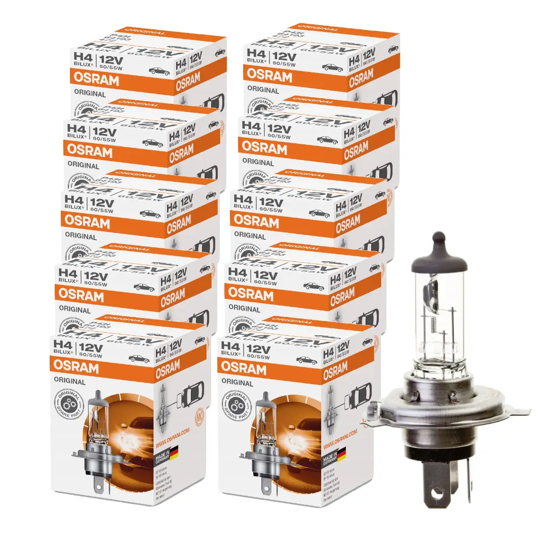 Zestaw 10 sztuk żarówek halogenowych OSRAM H4 12V 60/55W ORIGINAL LINE to doskonały wybór dla warsztatów, flot samochodowych oraz kierowców, którzy stawiają na niezawodność, trwałość i oryginalną jakość OEM. Klasyczne i niezawodne źródło światła stosowane jako oryginalne wyposażenie ( OEM ) w milionach samochodów na całym świecie. Wyróżnia się wysoką jakością, trwałością i stabilnymi parametrami świetlnymi, co czyni ją idealnym wyborem do codziennej jazdy.