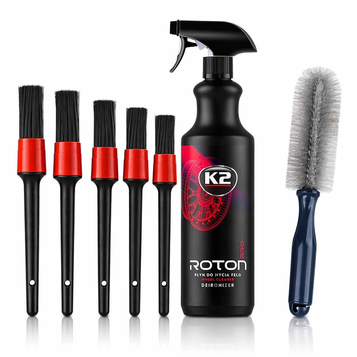 Zestaw do Czyszczenia Felg K2 Roton Pro 1L + 5 Pędzelków Detailingowych + Szczotka do Felg | Krwawa Felga Deironizer