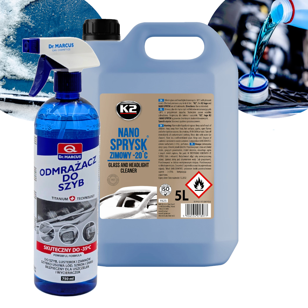 Zimowy zestaw samochodowy 2w1 - Odmrażacz do szyb Dr. Marcus Titanium -35°C + Płyn zimowy do spryskiwaczy K2 NANO SPRYSK 5L -20°C